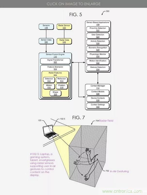通过专利中的附图,我们可以了解这项发明是如何基于雷达传感器的空中手势识别,来以某种方式对设备进行控制。