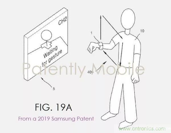 在专利附图1中,谷歌展示了空中手势应用可以用于包含雷达传感器的智能手表。在最近三星获得授权的一件专利中,如下图(FIG. 19A)所示,空中手势识别可能成为三星未来智能手表的一个技术特征,例如用Galaxy智能手表来控制未来的三星电视。